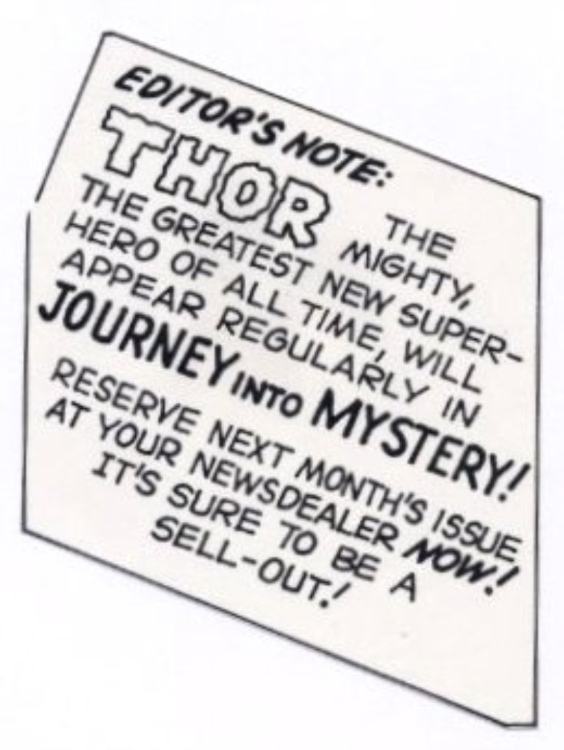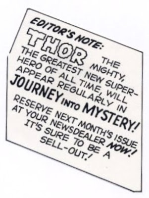 Above is the original final caption box of THOR'S origin from JIM #83 before it was changed to how it saw print, below. (With Thor being misspelled THORR.) Interesting to see that perhaps Thor was intended as a try-out character to test reader reaction before launching him in a series. I say "perhaps" because this may just have been a gimmick to give readers the idea that they had a say in what was published. I'd imagine that it's more than likely the next few episodes were already lying in a drawer in Stan's office.