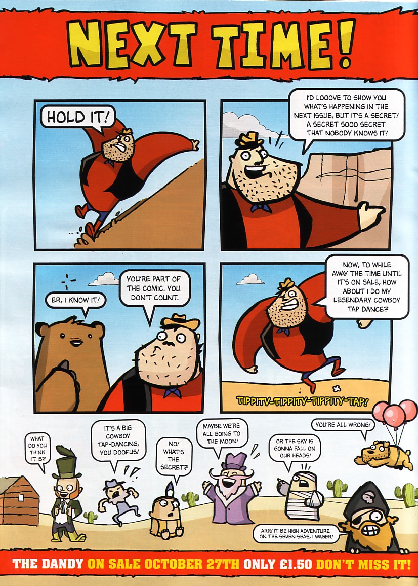 So far, I have studiously avoided specifically naming any particular strip or artist that I'm not so keen on, but JAMIE SMART'S DESPERATE DAN strip seems to be the focus of a lot of less-than-positive attention elsewhere on the internet. I'm assuming he letters the strip himself in the new Dandy, but if so, he really isn't doing himself any favours. Have a look at the DD trailer page (above) from the OLD Dandy. His art doesn't seem quite as roughly finished, and the overall look of the strip is vastly improved with more uniform frame borders and consistently rendered, upper case lettering. I'm sure at least some of the critics would look more favourably on the strip if it looked like this. (Although I'd still prefer a slightly more detailed version - after all, the original look had been established for nearly 70 years.)