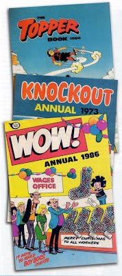 A good many months back, the now defunct CRIKEY! magazine (#12) printed an article about Christmas Annuals. For some reason which still escapes me, they had a picture of three annuals in a vertical row, so that you could see the first one, the title of the second one, and part of the third one. As a visual presentation it was a bit of a washout, to be frank. Why show illustrations of something which you can't see? What really annoyed me was that the second annual was the 1973 KNOCKOUT ANNUAL, which has as Christmassy a cover as you could ever wish to cast eyes upon. (And you had to wish - you sure couldn't see it on the page.)