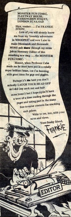 FRANKIE STEIN, who had first appeared back in 1964 in WHAM! illustrated by the magnificent KEN REID, before reappearing in 1973 in SHIVER & SHAKE drawn by the amazingly prolific ROBERT NIXON (and then-currently published in WHOOPEE) was the figurehead editor, an obvious choice given the comic's 'comedy-horror' theme.