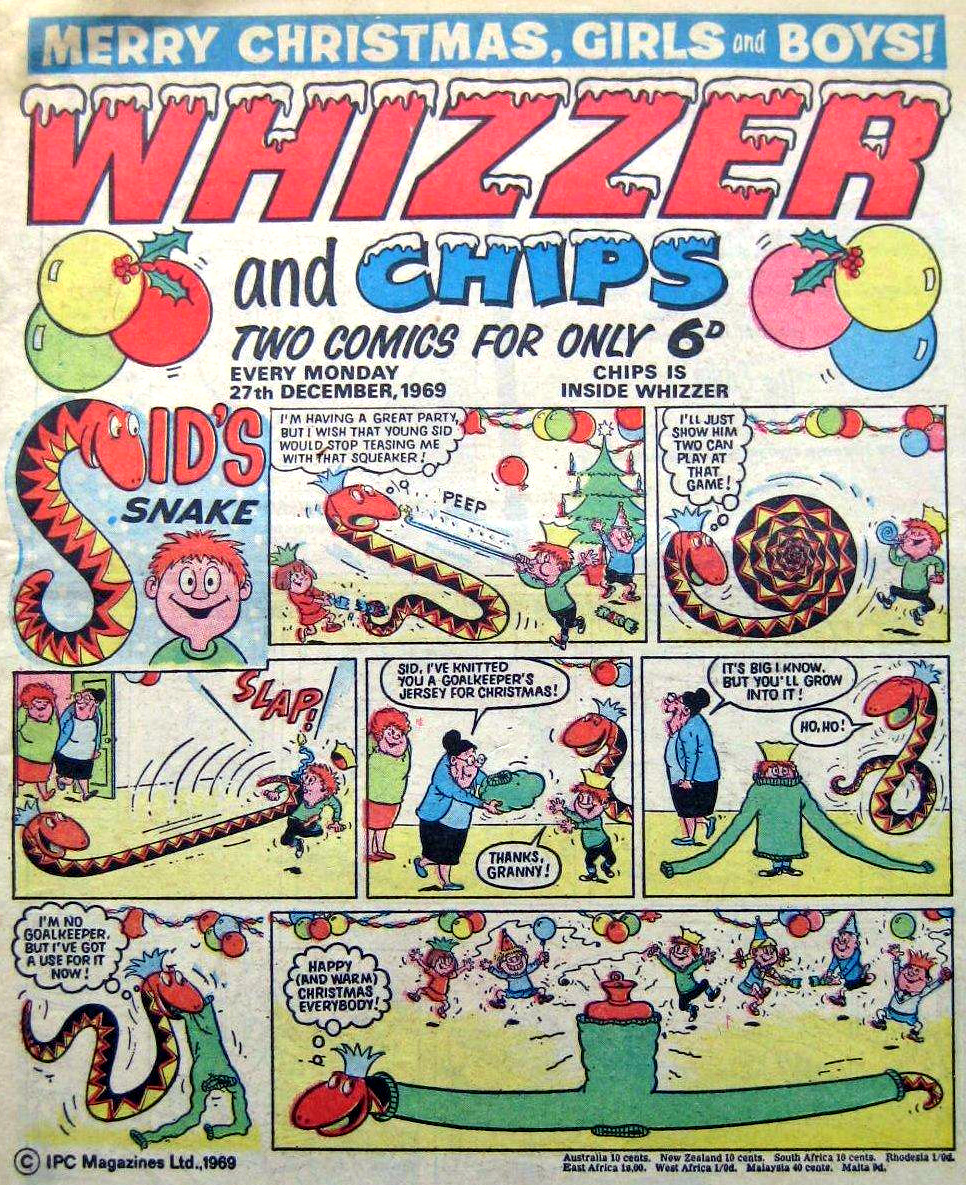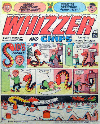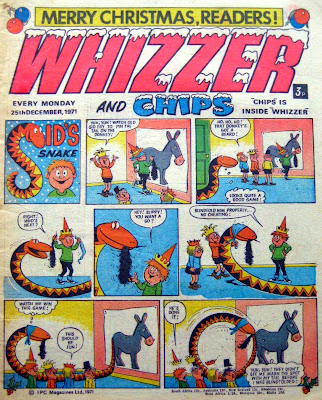 Continuing with our Christmas comic covers selection, here's a few from one of the last long-running great humour publications to be released by IPC - WHIZZER & CHIPS. Ol' W&C lasted about twenty-one years before the plug was pulled and it was merged with BUSTER. One of my greatest thrills was when BOB PAYNTER (who was then group editor of the IPC Humour Dept) asked me - at the end of a busy day - to letter the SID'S SNAKE and SHINER strips on the respective covers of both sections of the comic when I was down in London on one of my regular visits back in the mid-'80s. After an eight or nine hour journey without sleep on a coach and then working for eight hours, I was probably too fatigued to do my absolute best, but they turned out okay. Anyway, soak up the atmosphere of these fab festive favourites from years gone by.