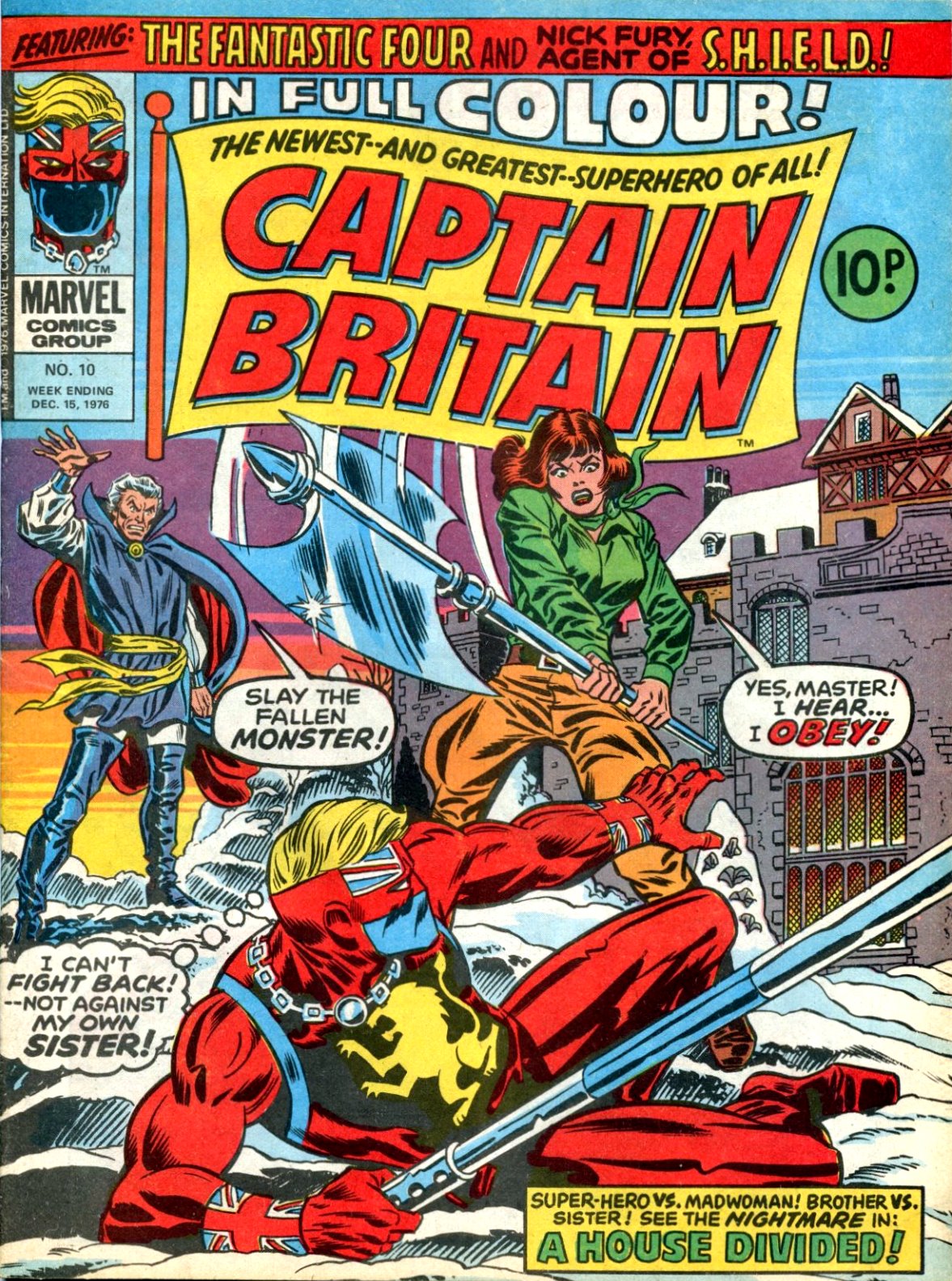 BEHOLD! The ever-lovin' tenth issue of CAPTAIN BRITAIN from 1976. Although it's dated December 15th, it actually came out the week before (8th), as is the way of British weekly comics. (No, they don't all come out on Dec 8th - I mean they usually come out a week before the date on the cover. There are exceptions however.)