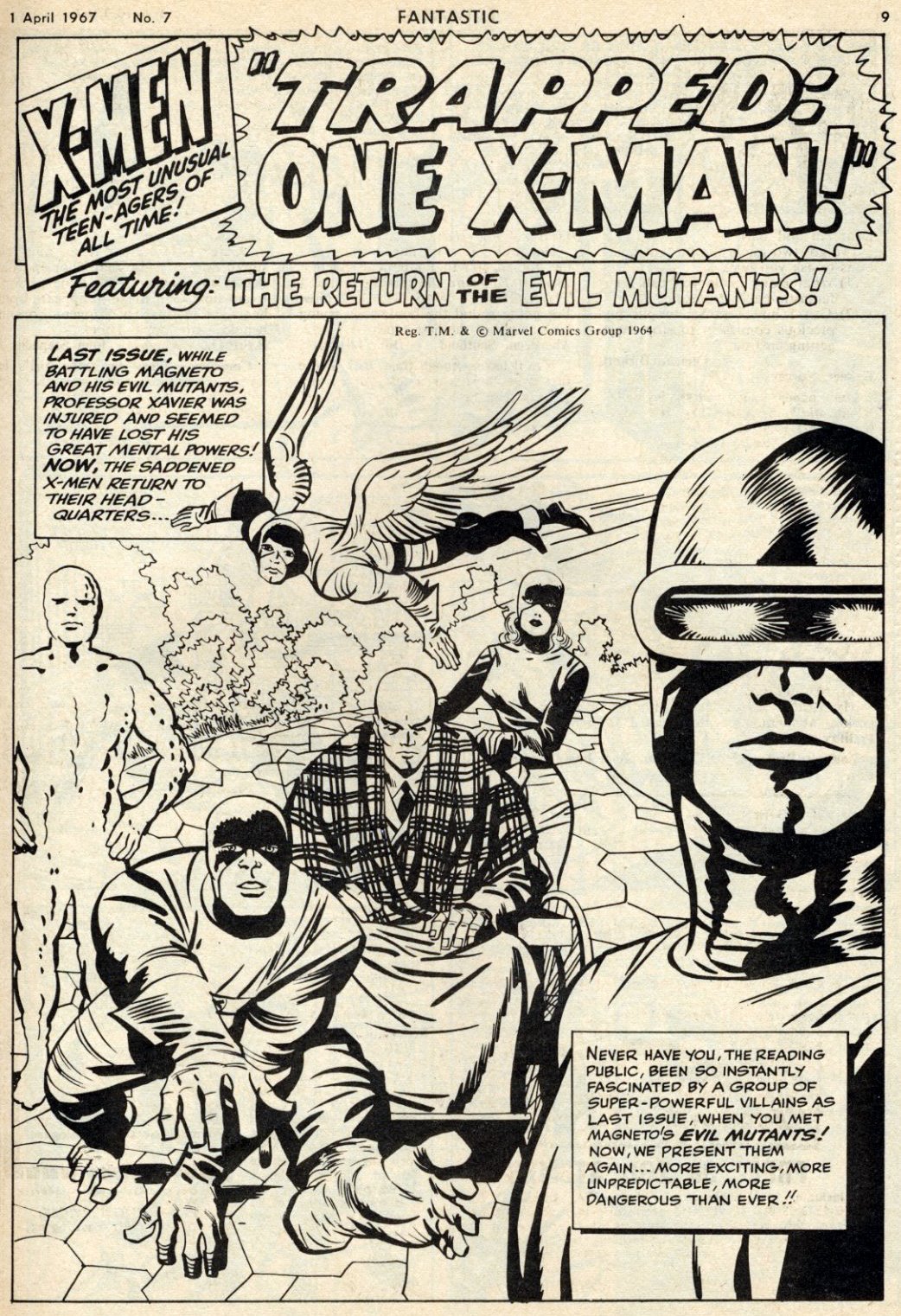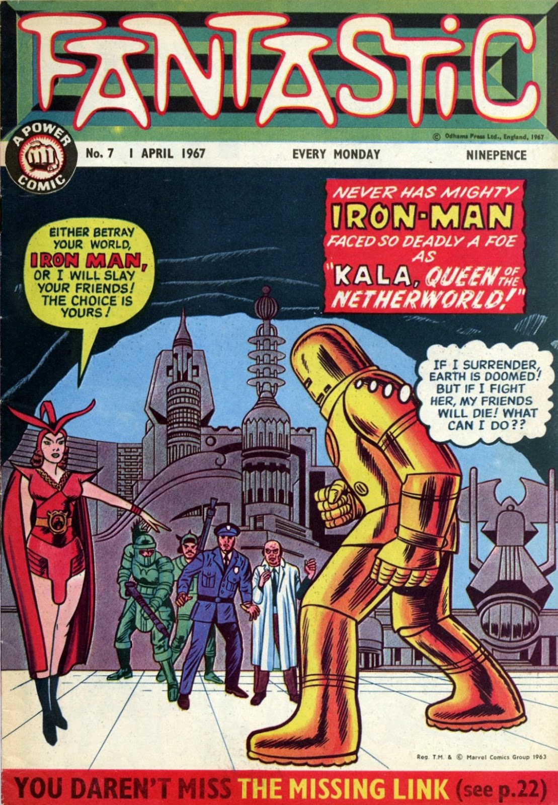 The issue in question was #7 (cover-dated April 1st) - and I was hooked! How could I not be, with stories like THOR - "THE THUNDER GOD AND THE THUG!", X-MEN - "TRAPPED: ONE X-MAN!", IRON MAN - "VERSUS KALA, QUEEN OF THE NETHERWORLD!", alongside the superb adventures of THE MISSING LINK for good measure? I soon acquired the earlier issues, and it wasn't long before I became a POWER COMICS junkie, buying all five of the weekly publications regularly. (Wham!, SMASH!, POW!, Fantastic, and TERRIFIC.) Fantastic had forty pages per issue, but not even that number could accommodate the above tales in their entirety, so only the first halves of the Thor and X-Men stories were presented, the remainder of these particular adventures being completed the following week. These early LEE/KIRBY/HECK MARVEL epics were printed in black and white, but that - and the fact that some characters' names were changed from their American originals - didn't seem to spoil the readers' enjoyment one whit.