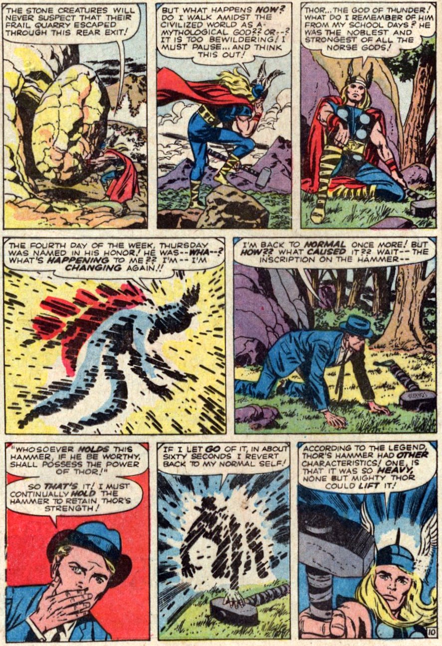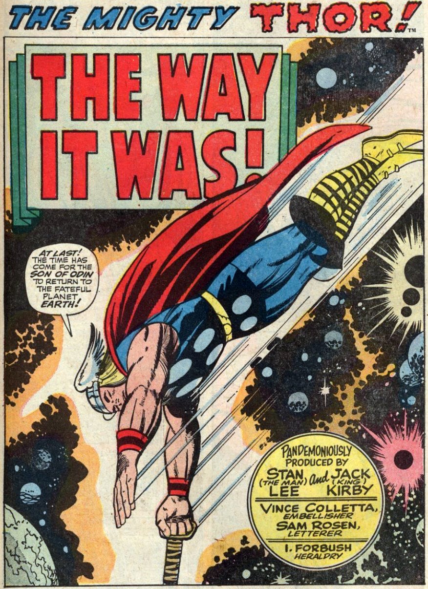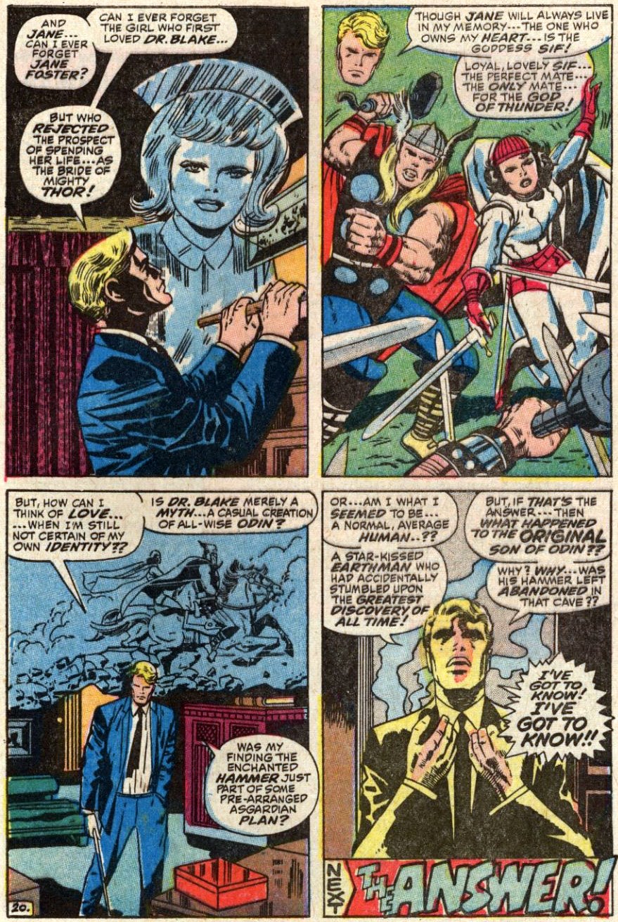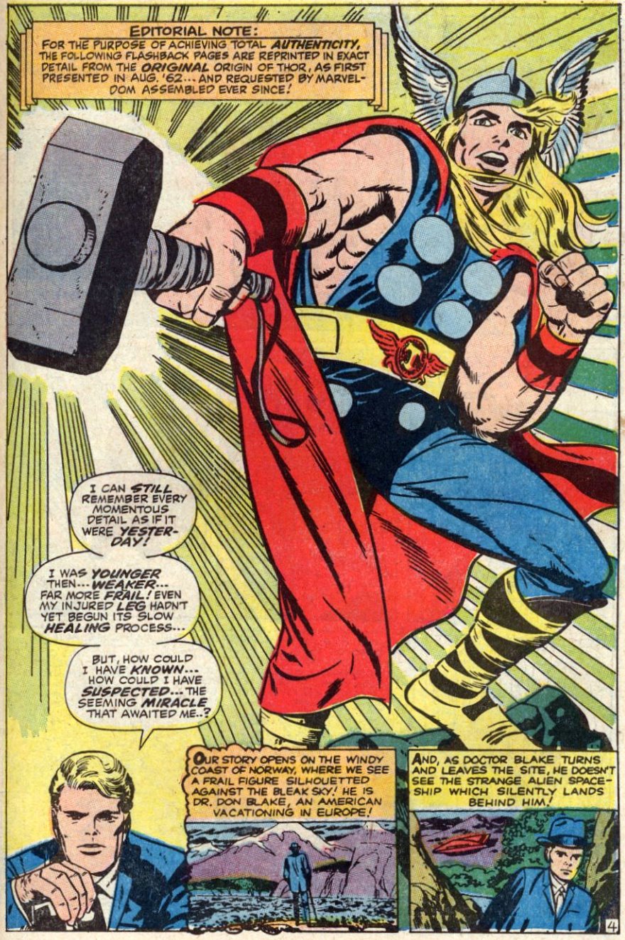 "THE WAY IT WAS!" proclaims the splash page, and that's precisely what it delivers - a look back at how Thor The Mighty (as he was originally referred to) came to be. Ol' Goldilocks' origin from JOURNEY INTO MYSTERY #83 is re-presented, with some small alterations to its splash to accommodate a flashback scenario. If you compare DON BLAKE's arm in the far-right bottom picture with its original printing, you'll see that it has been extended outwards to accentuate the appearance of his limp.