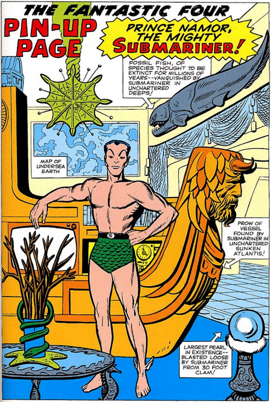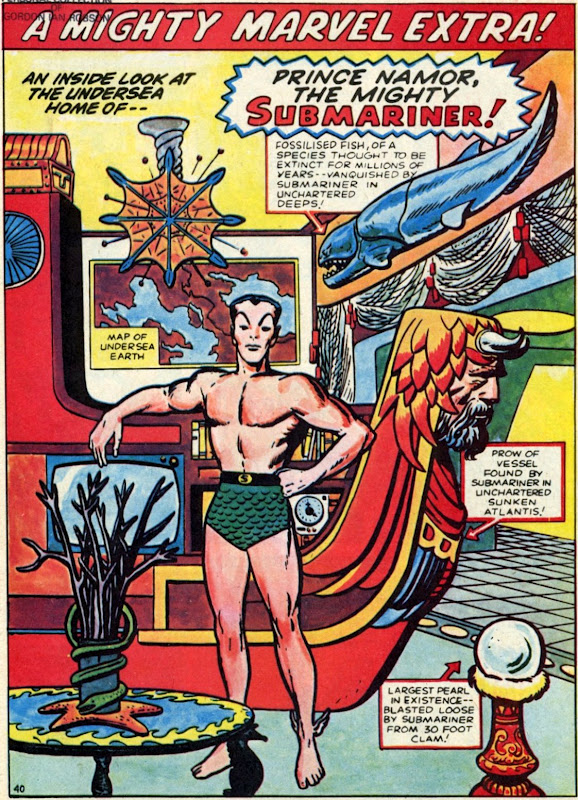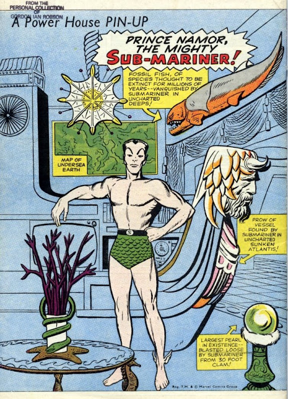 Sufferin' Shad! Take a look at the above pin-up from the 1962 issue of FANTASTIC FOUR #11 - it's only the avenging son of Atlantis himself, PRINCE NAMOR, the mighty SUB-MARINER! This pulsating pin-up next appeared in Britain on the back cover of TERRIFIC #1 in 1967, before turning up yet again in 1973 as a back-page pin-up in THE MIGHTY WORLD OF MARVEL #15.